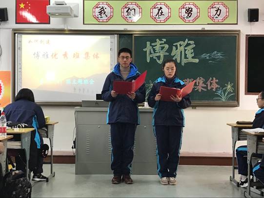 王舟勇校长在班会课上提出了对优秀班集体建设的建议。王校长希望每位同学认识到一个博雅的优秀班集体是班风好、学风好的班集体。一个班级能够达到博雅的目标,必须真正理解“博”、“雅”的涵义。明确“博”指认真学习,广泛吸收知识,锻炼思维,把知识融会贯通、学以致用;“雅”指雅正,成为文雅的人,有文明、守底线,能够遵守学校规章制度,遵守新的中学生守则与规范。